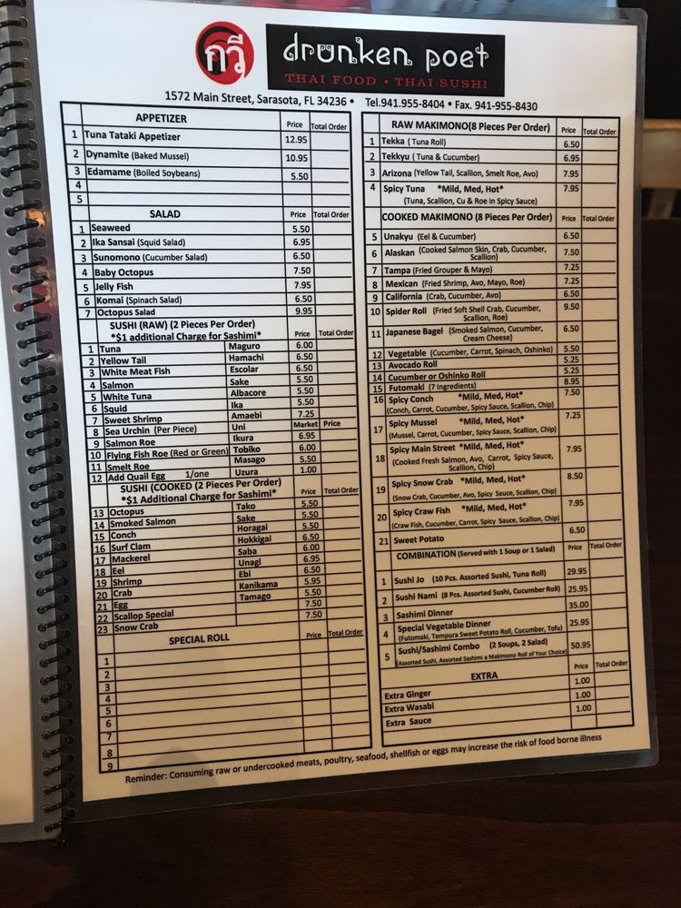 Drunken Poet, located in Sarasota, FL, is a Thai - Sushi Bar known for its inviting atmosphere and delicious food. Offering a variety of vegan and vegetarian options, this restaurant caters to a diverse range of tastes. Customers praise the prompt and friendly service, with recommendations from the staff adding to the dining experience. The menu features unique dishes like the Lucas and Fiery Roll, with the option to customize spice levels. The Pad Thai is a standout dish, described as light and packed with flavor. Despite some minor ambiance issues, guests appreciate the care put into each dish. The Queen Kong sushi plate and Pineapple Fried Rice are highlighted for their creativity and distinct flavors. With ample street parking and a women-owned establishment, Drunken Poet is a must-visit for those seeking quality Thai cuisine in a relaxed setting.